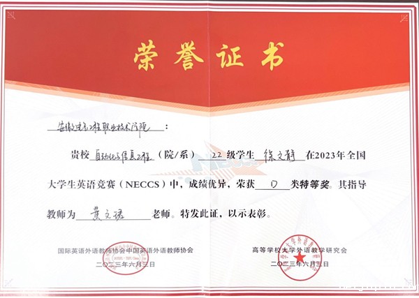 在6月3日落幕的2023年全国大学生英语竞赛(National English Competition for College Students,简称“NECCS”)决赛中,自动化与信息工程系22电气一班的徐文静同学获得D类特等奖。