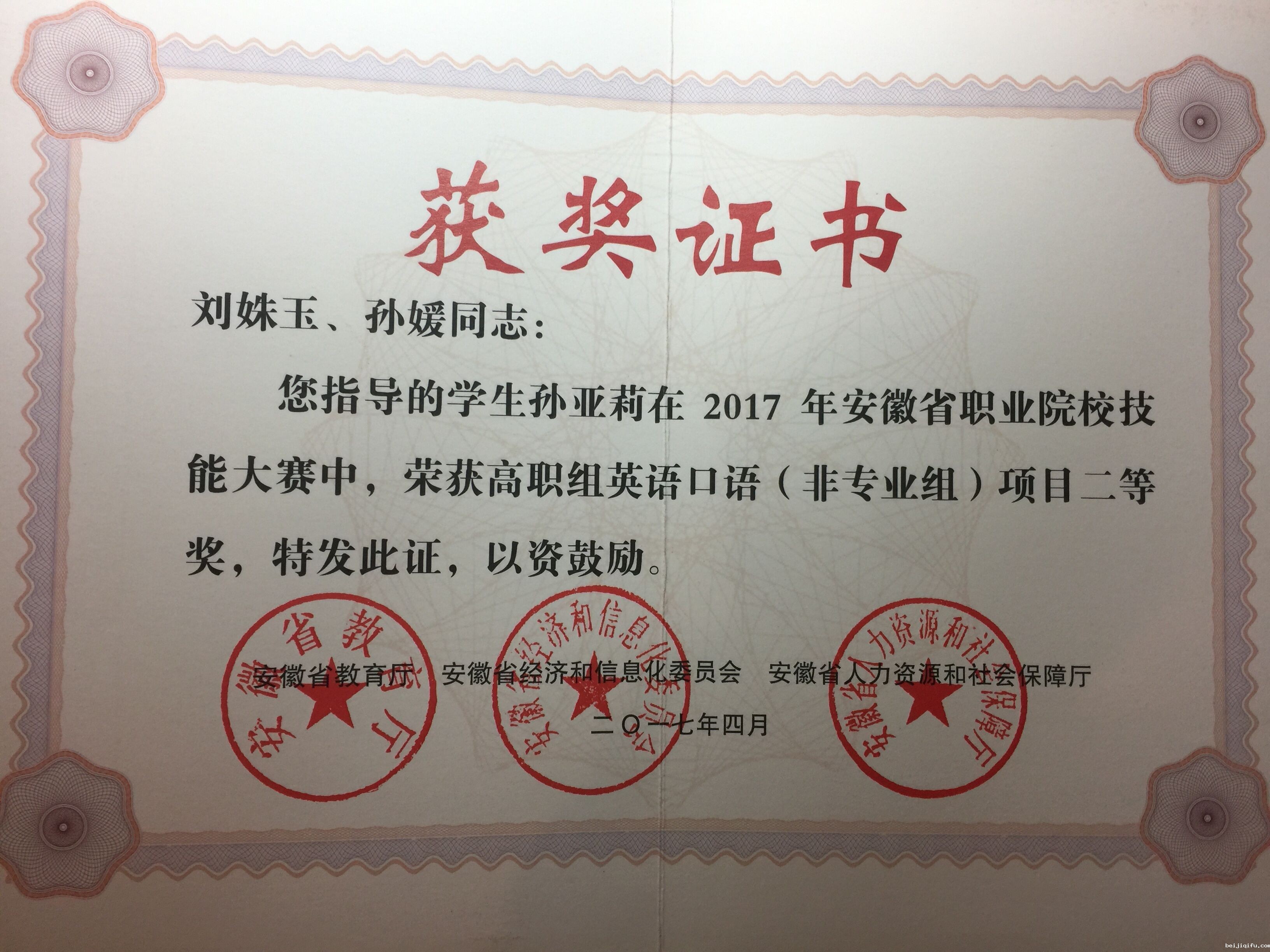 2012年,我院选手在全省高职英语口语大赛中荣获二等奖